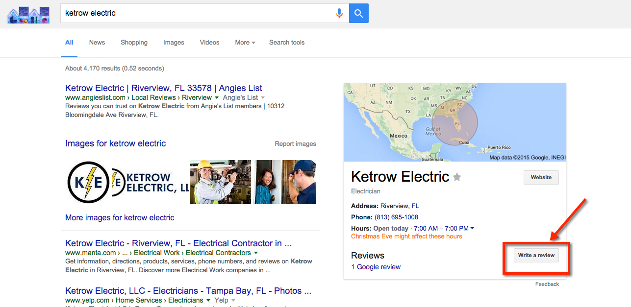 You have to have a Google account to do a Google review. If you do, please do a Google search for Ketrow Electric. The search will find Ketrow Electric. Click on the "Write a review button".